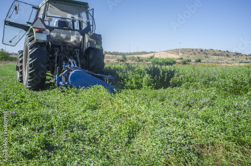 Fototapeta premium Tractor cutting and swathing alfalfa