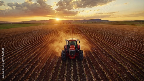 © tunanon, Obraz premium Tractor Driving Through Expansive Spring Field