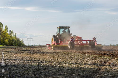 Fototapeta premium tractor during sowing in an open field on a sunny day