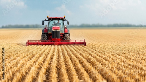 © Arthur Constantine, Obraz premium Tractor Harvesting Field in Golden Wheat Landscape
