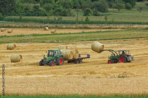 © Nevio, Fototapeta premium Tractor loading large round bales of straw onto trailer on a cornfield after harvest