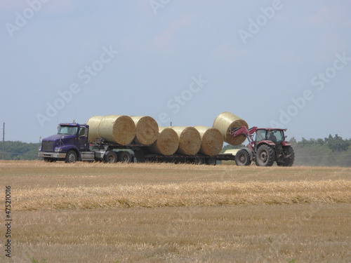 © dvande, Fototapeta premium Tractor loading large round hey bails onto semi truck trailer for transport
