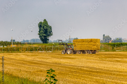 Fototapeta premium tractor loads hay bales on trailer