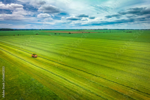 © narozhnii, Fototapeta premium Tractor mowing green field, aerial view