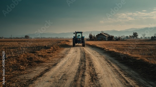 © khumthong, Fototapeta premium Tractor on a Rural Dirt Road at Sunset Countryside Farmland Scene
