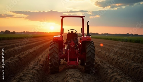 © abangaboy, Fototapeta premium Tractor on Farm Field at Sunset