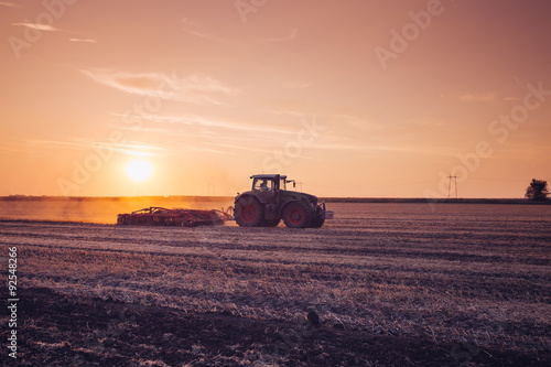 © Dusko, Fototapeta premium Tractor on the field by sunset.