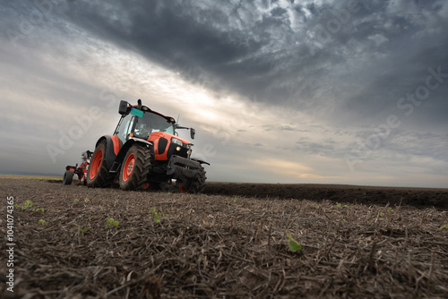 © Dusan Kostic, Fototapeta premium Tractor on the field during sunset.