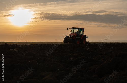 © Dusan Kostic, Obraz premium Tractor on the field during sunset.