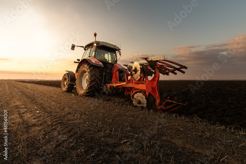 © Dusan Kostic, Obraz premium Tractor on the field during sunset.