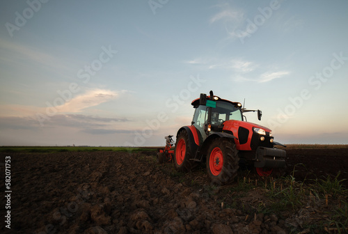 © Dusan Kostic, Fototapeta premium Tractor on the field during sunset.