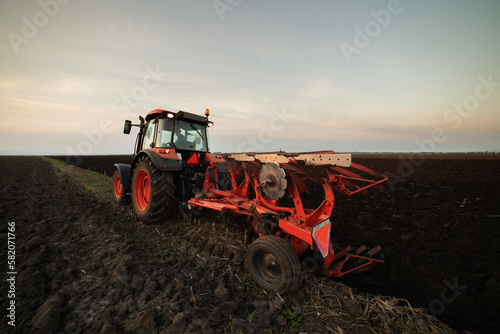 © Dusan Kostic, Obraz premium Tractor on the field during sunset.