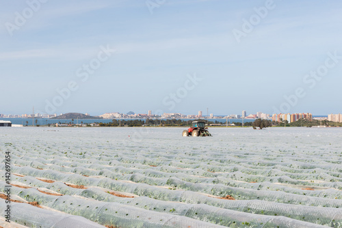 © kamira, Naklejka premium Tractor on the field with greenhouses.