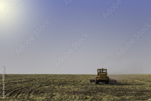 © Rinat, Fototapeta premium Tractor ploughing a field with a trail of dust behind it