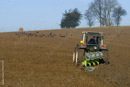 © Springfield Gallery, Obraz premium Tractor ploughing winter field with crows