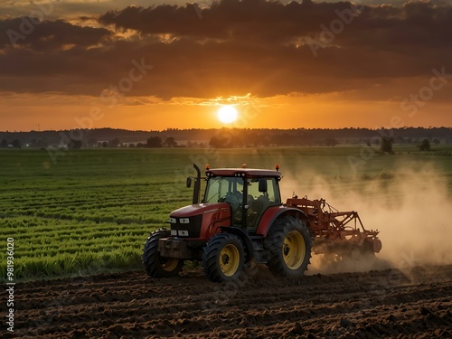 © Kasper, Fototapeta premium Tractor plowing a field at sunset, showcasing agricultural life.