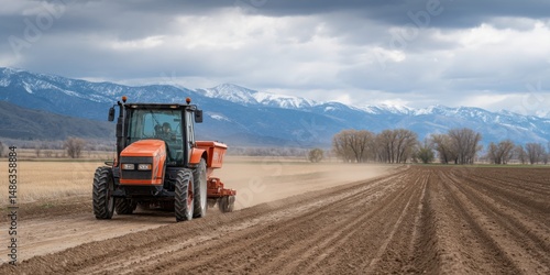 © Sergey, Obraz premium Tractor plowing a field with mountains in the background during overcast weather