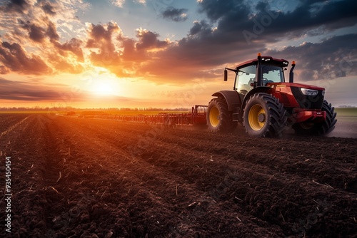 © fotofabrika, Obraz premium Tractor plowing fields at sunset in rural landscape during harvest season