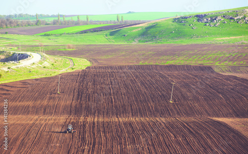 © niromaks, Fototapeta premium Tractor plows a field in the spring accompanied by rooks