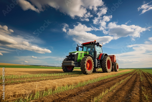 Fototapeta premium Tractor plows grain field with agriculture and grain concept. Generative ai