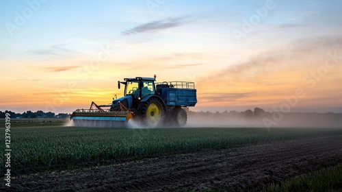 © artzone, Fototapeta premium Tractor Spraying Crops at Sunset