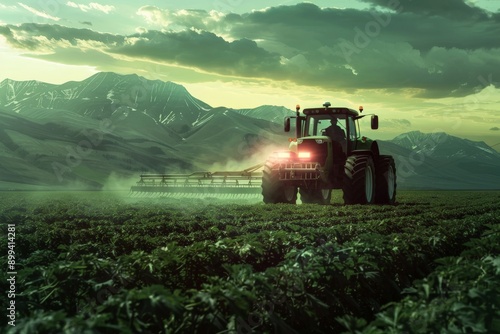 © KP, Fototapeta premium Tractor Spraying Crops in Mountainous Field.