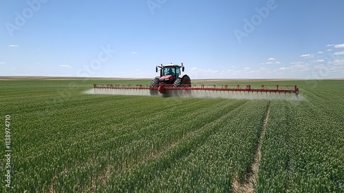Fototapeta premium Tractor Spraying Fertilizer Over Green Field Landscape