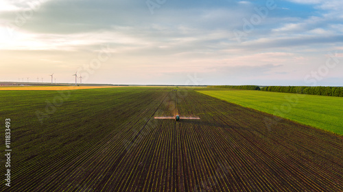 Naklejka premium Tractor spraying field at spring