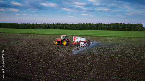Naklejka premium Tractor spraying field at spring