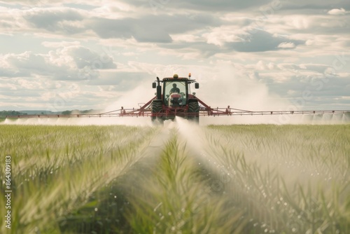 Fototapeta premium Tractor spraying pesticides and fertilizers on field