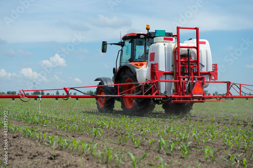 Fototapeta premium Tractor spraying pesticides at corn fields