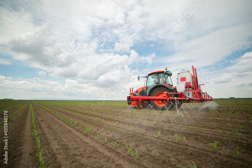 Fototapeta premium Tractor spraying pesticides at corn fields