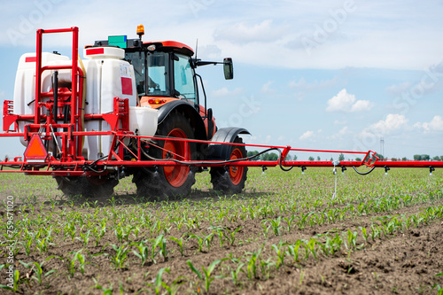 Fototapeta premium Tractor spraying pesticides at corn fields