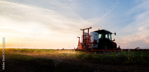 Fototapeta premium Tractor spraying pesticides at soy bean field
