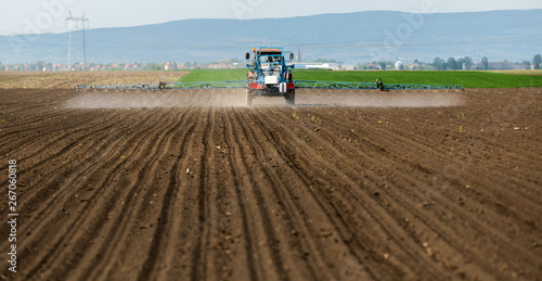 © Dusan Kostic, Fototapeta premium Tractor spraying pesticides at wheat field