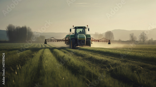 © Syntetic Dreams, Fototapeta premium Tractor spraying pesticides fertilizer on soybean crops farm field in spring evening. Smart Farming Technology and Sustainable Advanced Agriculture Practices. generative ai