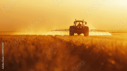 © Poramet, Fototapeta premium Tractor spraying pesticides in morning on soybean field