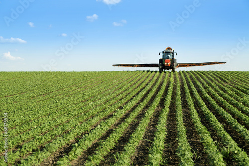 © oticki, Fototapeta premium Tractor spraying soybean crop field