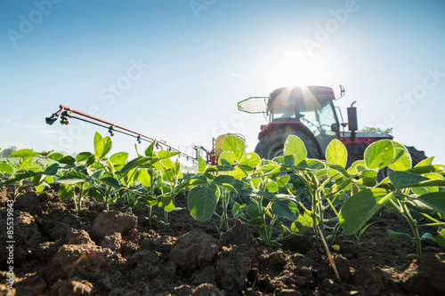 Naklejka premium Tractor spraying soybean crops with pesticides and herbicides