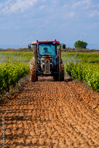 © JuanFrancisco, Fototapeta premium tractor spraying sulphate on the vineyard