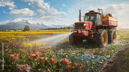 Fototapeta premium Tractor Spraying Water Over Vibrant Flower Field