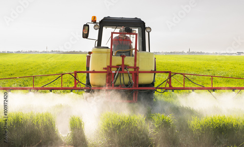 © Dusan Kostic, Obraz premium Tractor spraying wheat field