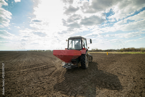 © Vesna, Obraz premium Tractor spreading artificial fertilizers