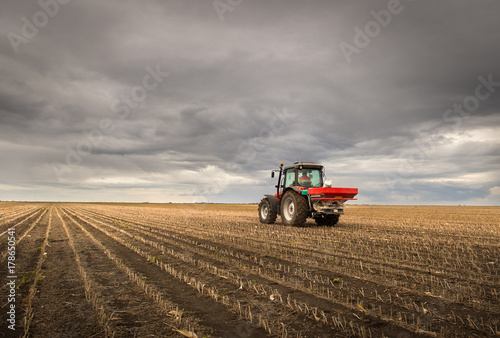 Obraz premium Tractor spreading artificial fertilizers