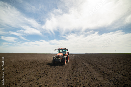 © Vesna, Obraz premium Tractor spreading artificial fertilizers