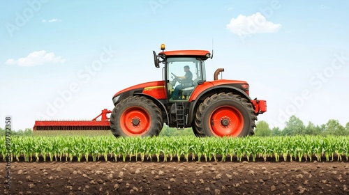 © fotofabrika, Obraz premium Tractor tilling a vibrant green field under a clear blue sky during a sunny daytime