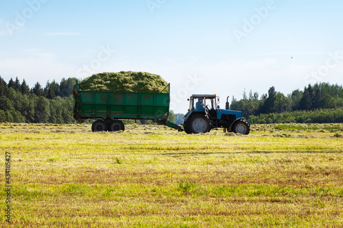 © наталья саксонова, Fototapeta premium Tractor with a trailer filled with freshly cut grass. Hay making, grassland. General plan, panorama. Copy space.