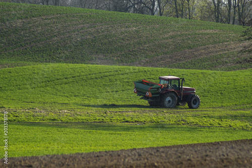 © Mike Mareen, Obraz premium tractor with seeder sowing grain in spring