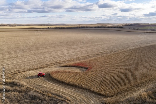 © AHNH2, Obraz premium Tractor Working in Vast Agricultural Field Under Dramatic Sky
