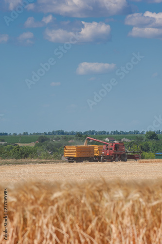 Fototapeta premium Tractors harvest wheat on the field